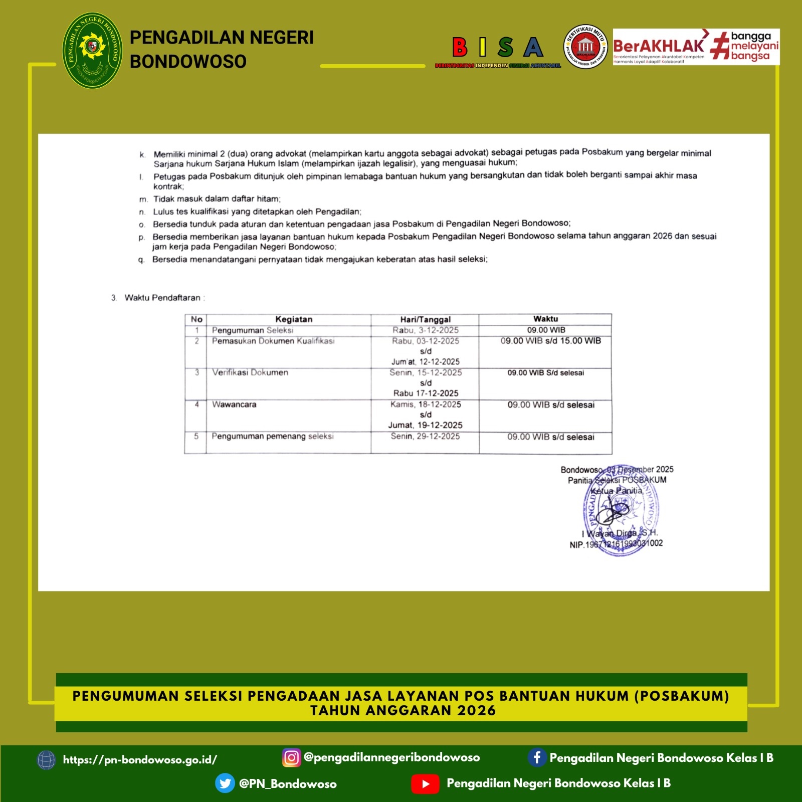 dengan ini kami mengadakan Seleksi Lembaga Pemberian Layanan Bantuan Hukum pada Pos Bantuan Hukum (POSBAKUM) Pengadilan Negeri Bondowoso Tahun Anggaran 2026 dengan ketentuan sebagaimana tercantum pada flyer tersebut di atas.