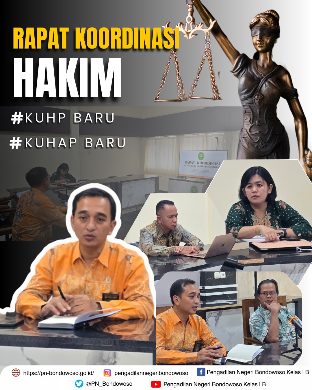 Pengadilan Negeri Bondowoso menyelenggarakan Rapat Koordinasi Hakim dalam rangka penguatan pemahaman dan implementasi regulasi hukum pidana nasional terbaru. Rapat yang berlangsung di ruang Media Center diikuti oleh Ketua Pengadilan dan para Hakim, dengan agenda utama pembahasan penerapan Undang-Undang Nomor 1 Tahun 2023 tentang Kitab Undang-Undang Hukum Pidana (KUHP), Undang-Undang Nomor 20 Tahun 2025 tentang Kitab Undang-Undang Hukum Acara Pidana (KUHAP), dan Undang-Undang Nomor 1 Tahun 2026 tentang Penyesuaian KUHP.