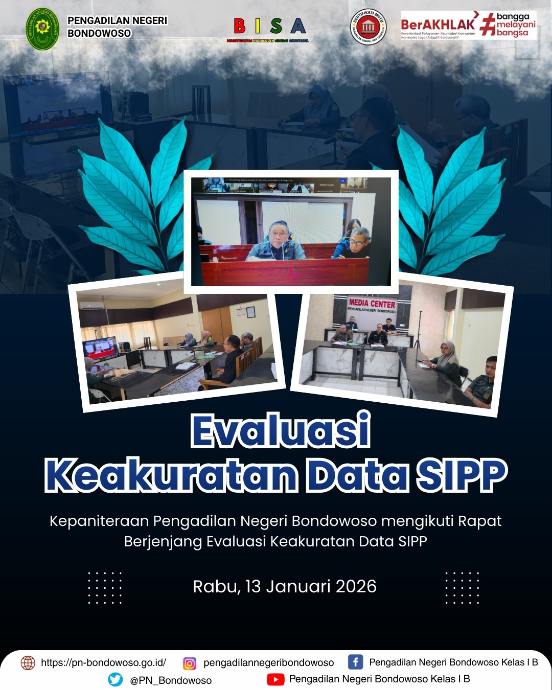 Kepaniteraan Pengadilan Negeri Bondowoso mengikuti Evaluasi Keakuratan Data SIPP (SIPP) yang digelar secara daring melalui platform Zoom oleh Pengadilan Tinggi Surabaya. Tujuan utama adalah mengevaluasi adaptasi SIPP terhadap Kitab Undang-Undang Hukum Pidana (KUHP) baru (UU No. 1 Tahun 2023) dan Kitab Undang-Undang Hukum Acara Pidana (KUHAP) baru (UU No. 2 Tahun 2023), yang mulai berlaku efektif sejak 2 Januari 2026. Evaluasi berlanjut dengan memaparkan beberapa kendala-kendala yang belum sepenuhnya terintegrasi dengan register elektronik di Sistem Informasi Pengadilan yang sesuai dengan KUHAP baru.