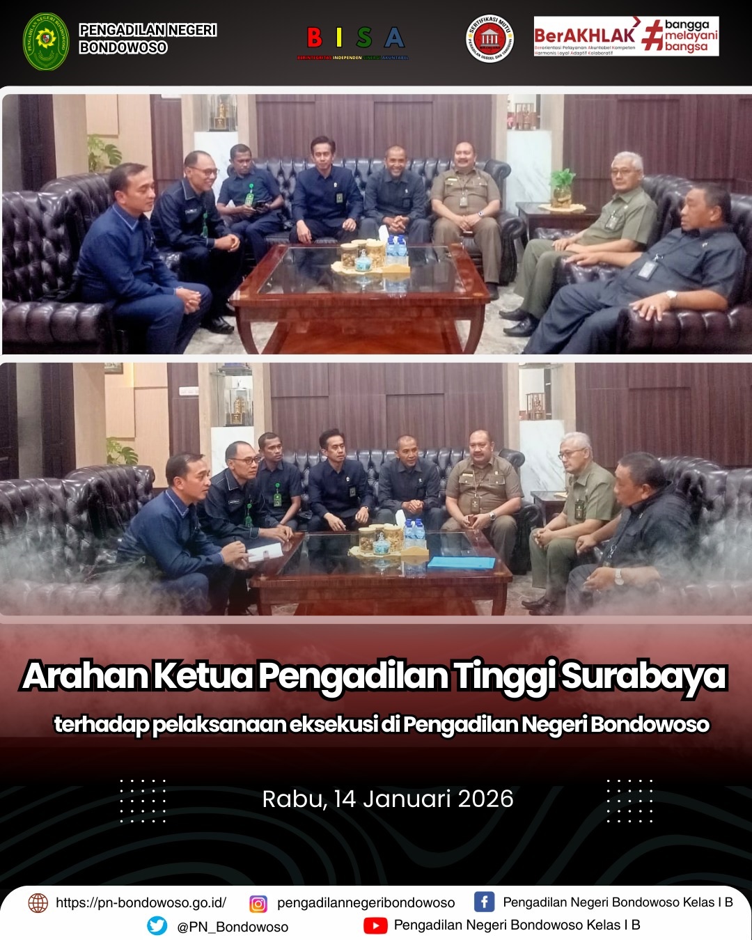 Melalui arahan Ketua Pengadilan Tinggi Surabaya ini, diharapkan Pengadilan Negeri Bondowoso dapat melaksanakan eksekusi perkara secara tepat, efektif, serta memberikan rasa keadilan dan kepastian hukum bagi para pihak pencari keadilan.