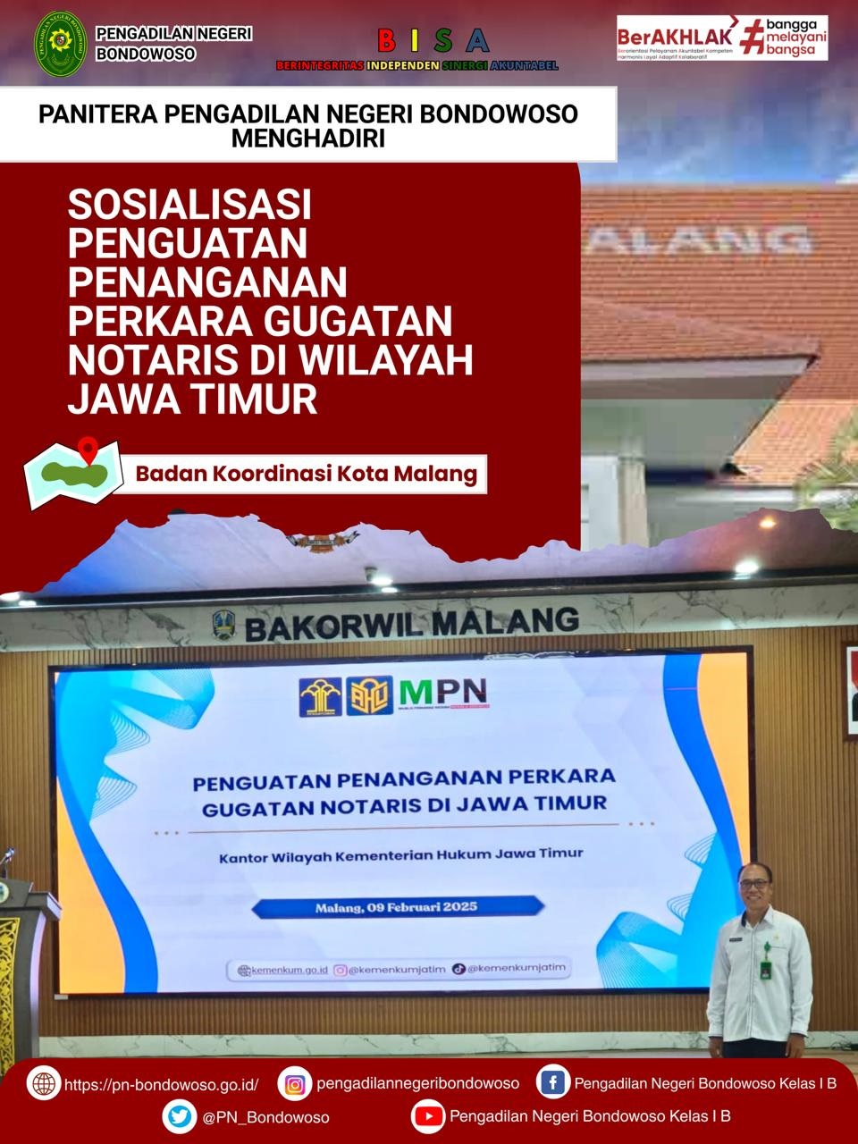 Panitera Pengadilan Negeri Bondowoso, Bapak I Wayan Dirga, SH. menghadiri kegiatan Sosialisasi Penguatan Penanganan Perkara Gugatan Notaris di Wilayah Jawa Timur yang dilaksanakan di Badan Koordinasi Kota Malang.