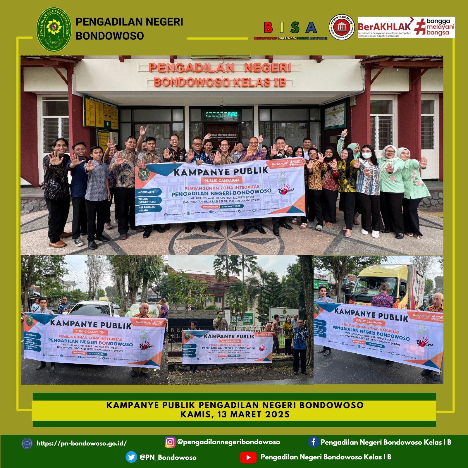 Pengadilan Negeri Bondowoso melaksanakan Kampanye Publik Zona Integritas Menuju Wilayah Bebas Korupsi (WBK) dan Wilayah Birokrasi Bersih Melayani (WBBM). Kegiatan ini sebagai wujud komitmen
