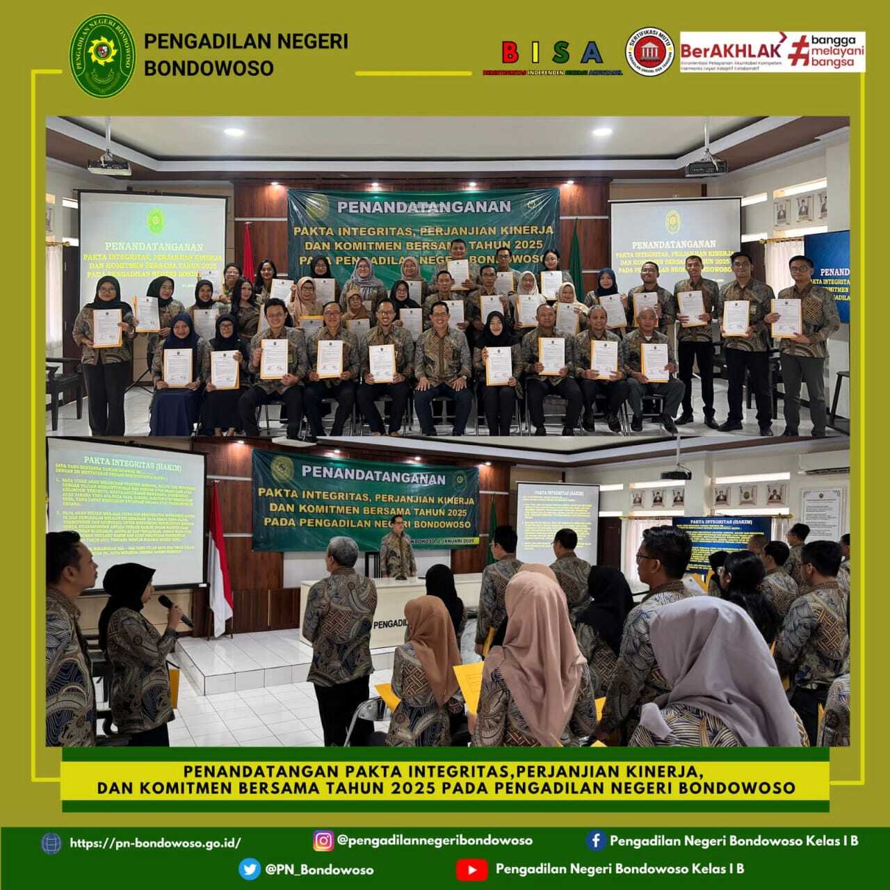 Pengadilan Negeri Bondowoso melaksanakan kegiatan Penandatanganan Pakta Integritas, Perjanjian Kinerja, dan Komitmen Bersama Tahun 2025 di Aula Pengadilan Negeri Bondowoso.