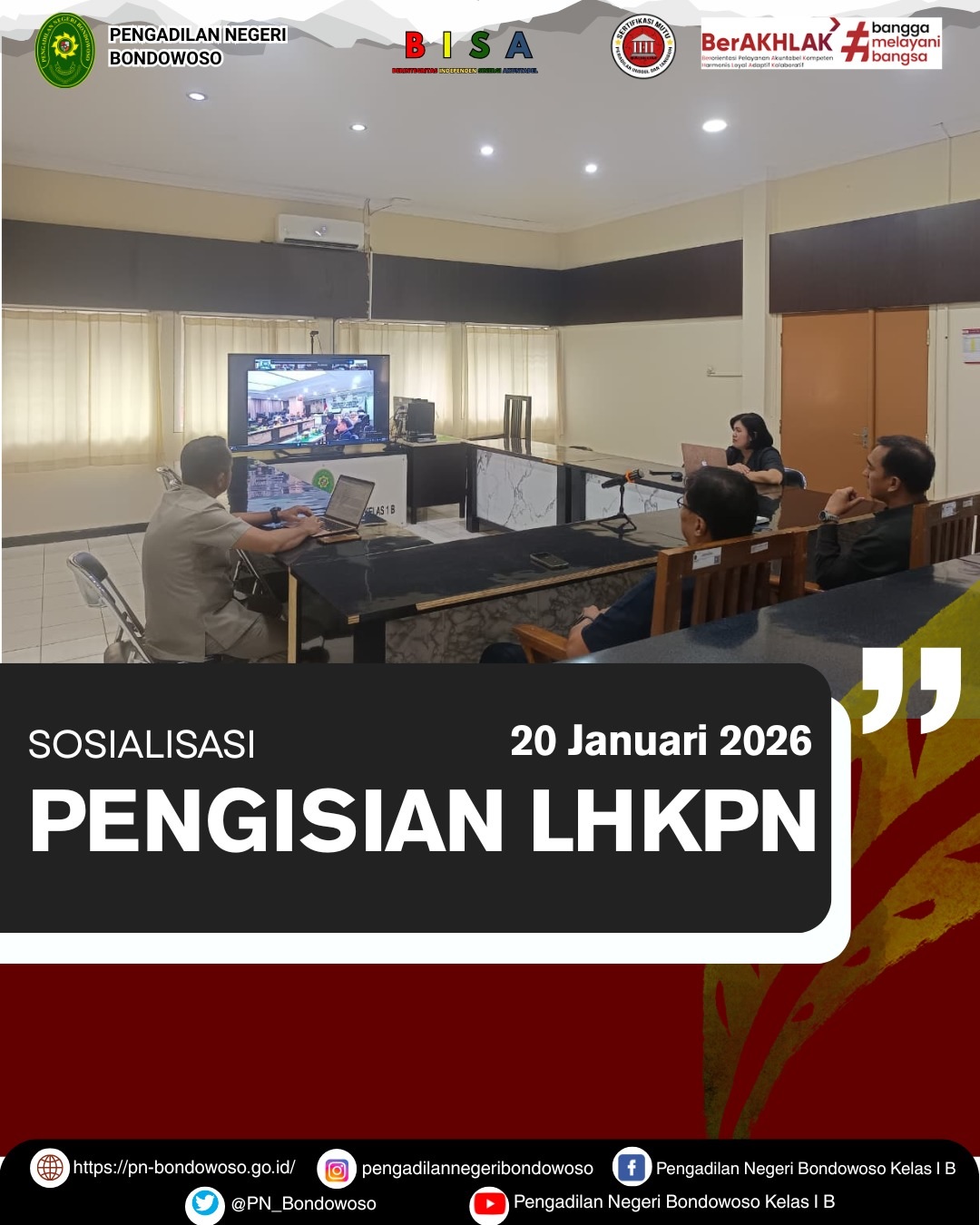Dalam rangka meningkatkan kepatuhan dan pemahaman aparatur terhadap kewajiban pelaporan harta kekayaan, Pengadilan Negeri Bondowoso mengikuti kegiatan Sosialisasi Pengisian Laporan Harta Kekayaan Penyelenggara Negara (LHKPN) yang diselenggarakan secara daring melalui aplikasi Zoom Meeting, pada hari Selasa, tanggal 20 Januari 2026.