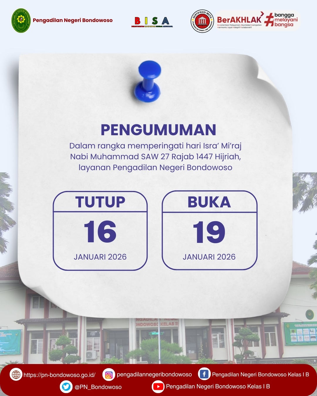 Ditetapkan sebagai hari libur nasional dalam rangka memperingati Hari Isra' Mi'raj Nabi Muhammad SAW. Diberitahukan bahwa seluruh kegiatan operasional kantor Pengadilan Negeri Bondowoso libur pada tanggal tersebut. Kegiatan kantor akan kembali berjalan normal pada hari Senin, 19 Januari 2026.
