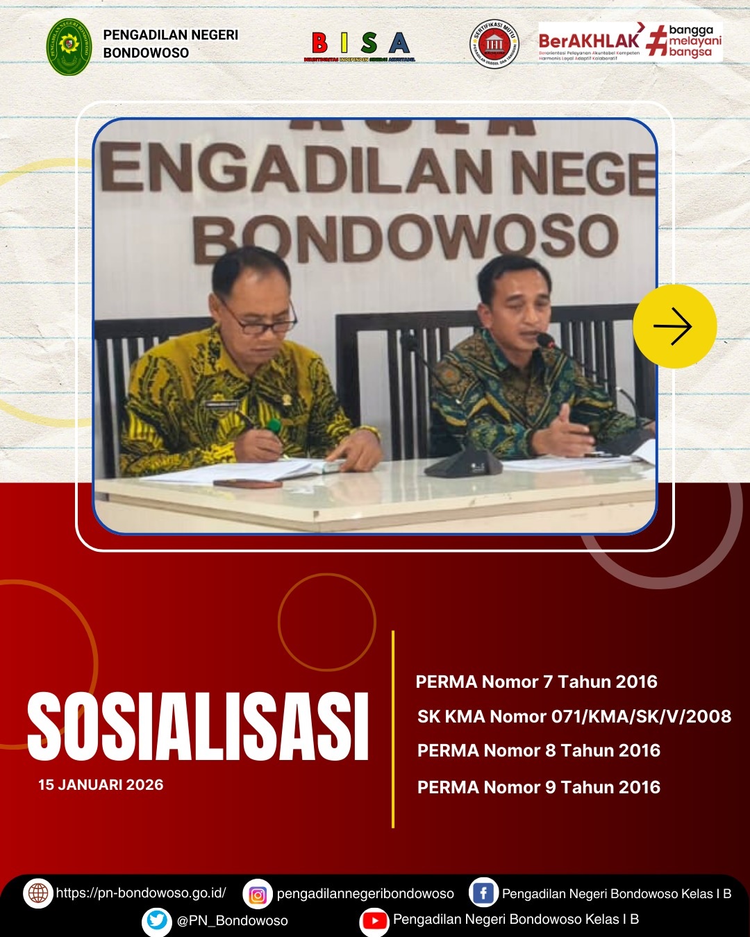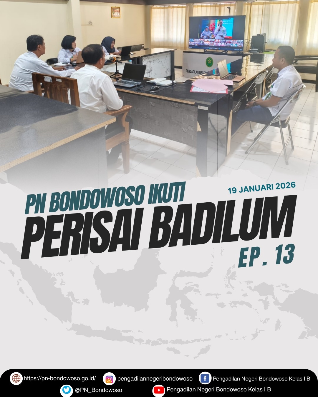 Pada hari Senin, tanggal 19 Januari 2026, Pengadilan Negeri Bondowoso mengikuti kegiatan Pertemuan Rutin Sarasehan Badan Peradilan Umum (PERISAI) Badilum Episode 13 yang diselenggarakan secara daring melalui platform Zoom Meeting.