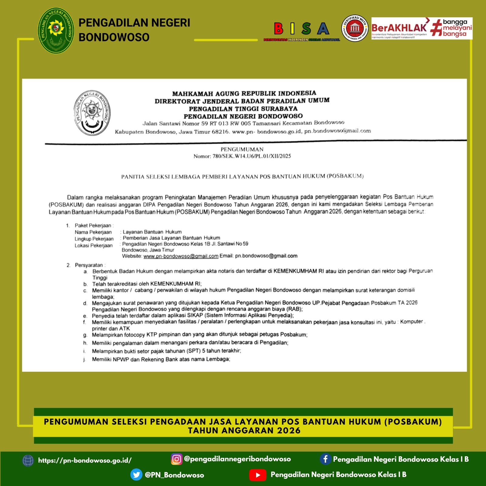 Dalam rangka melaksanakan program Peningkatan Manajemen Peradilan Umum khususnya pada penyelenggaraan kegiatan Pos Bantuan Hukum (POSBAKUM) dan realisasi anggaran DIPA Pengadilan Negeri Bondowoso Tahun 2026,